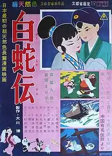 Panda and the Magic Serpent (白蛇伝, Hakujaden), also known as The Tale of the White Serpent, is the first color anime feature film, released in 1958. It was one of the first three anime films to be released in America, under the title Panda and the Magic Serpent, premiering in 1961, the month after Magic Boy.[1] It is also known variously as Legend of the White Snake, The Great White Snake and The White Snake Enchantress. In April 2019, a restored version of the film was selected to be shown in the Cannes Classics section at the 2019 Cannes Film Festival.[2]