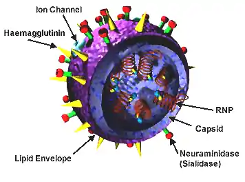 | Transmission electron micrograph of the pandemic H1N1/09 influenza virus photographed at the CDC Influenza Laboratory. The viruses are 80–120 nanometres in diameter.[1] | |