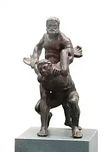 In Greek mythology, it was said that the heroes Heracles and Theseus invented pankration as a result of using both wrestling and boxing in their confrontations with opponents. Theseus was said to have utilized his extraordinary pankration skills to defeat the dreaded Minotaur in the Labyrinth. Heracles was said to have subdued the Nemean lion using pankration, and was often depicted in ancient artwork doing that.[1] In this context, pankration was also referred to as pammachon or pammachion (πάμμαχον or παμμάχιον), meaning "total combat", from πᾶν-, pān-, "all-" or "total", and μάχη, machē, "matter". The term pammachon was older,[3] and would later become used less than the term pankration.