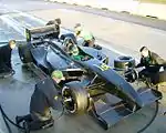 The Panoz DP01 was developed to be safer, and less aero-dependent while racing closely with other cars than previously existing Champ Cars. The Panoz had numerous changes from the previous Lola car, including more downforce from the underbody. Approximately 60% of the car's 5,500 lb (2,500 kg) of downforce at 200 mph (320 km/h) came from the bottom of the car. It weighed about 1,550 lbs., and featured a 950-horsepower Cosworth XFE 2.65-liter turbocharged V8. The DP01 could go from 0-60 mph in 2.2 seconds, 0-100 mph in 4.2 seconds, and had an approximate top speed of 240 mph.[1] This was done by directing the air in a way so as to create additional downforce on the car, thereby effectively sucking it to the racetrack. This put less dependency on the front and rear wings in the event of a failure at high speed.