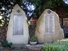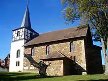 Built from rubble stone, the church of St. John and the vicarage, one of the few surviving timber-framed houses in the village, are listed buildings. The village scene is dominated by the former manor estate (Rittergut) of the Counts of Falkenstein. On the terrain of the old sheep farm stands a monument which recalls the events of the 1848 year of revolution. In another spot is a list of names and a memorial to the victims of the two world wars
