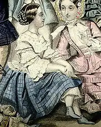 Ankle-length pantalettes for women were worn under the crinoline and hoop skirt to ensure that the legs were modestly covered should they become exposed. Pantalettes for children and young girls were mid-calf to ankle-length and were intended to show under their shorter skirts. Until the mid-19th century, very young boys were commonly dressed in dresses, gowns and pantalettes, though these were commonly associated with girls' clothing, until the boys were breeched at any age between 2 and 8 years of age,[1] and sometimes older. Young boys would be dressed in this fashion until at least they were toilet-trained.