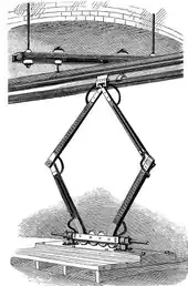 The pantograph, with a low-friction, replaceable graphite contact strip or "shoe" to minimise lateral stress on the contact wire, first appeared in the late 19th century. Early versions include the bow collector, invented in 1889 by Walter Reichel, chief engineer at Siemens & Halske in Germany,[2][3] and a flat slide-pantograph first used in 1895 by the Baltimore and Ohio Railroad[4]