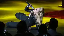 Madonna has performed the song on four of her world tours. She premiered the song in 1987, during her Who's That Girl World Tour, where she danced around the stage wearing a white Spanish-style dress designed by Marlene Stewart,[50] and a black leather jacket similar to the one she used in the music video. The screen in the background showed portraits of Pope John Paul II and then-President of the US Ronald Reagan,[51] along with scenes of John Perry III's short film, The Nightmare,[52] ending with the words "Safe Sex", as Madonna finished the song.[53] She dedicated the song to the Pope, marking her first conflict with the Vatican, as Pope John Paul II urged Italian fans to boycott her concerts.[54][55] Two different performances of the song on this tour can be found on the videos: Who's That Girl: Live in Japan, filmed in Tokyo, Japan, on June 22, 1987,[56] and Ciao Italia: Live from Italy, filmed in Turin, Italy, on September 4, 1987.[57]