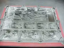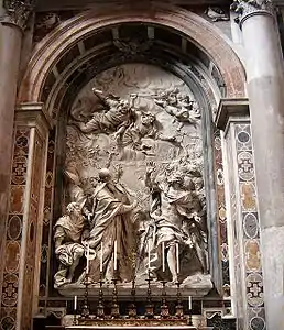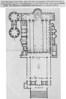 Although the original basilica's construction was begun during the reign of emperor Constantine I and completed in the fourth century, Pope Leo I (440–461) was the first pope buried in the Constantian basilica.[1] Over the centuries, both the atrium, chapels, and the nave of the basilica were packed with papal tombs, which were juggled between different sections of the church as construction took place on each section of the basilica. All that remains of the original tombs are a few sarcophagi and sculptural fragments.[2] Allegedly, Pope Julius II, the pope who initiated the destruction of the Constantinian basilica, wished to clear space for a "monstrous" tomb of his own by Michelangelo.[3]