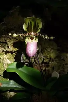 Paphiopedilum glaucophyllum has its natural habitat in rainy volcanic mountain slopes and moist limestone cliffs. It prefers sun to partial shade and calcareous soils with mosses, at an altitude of 200–700 metres (660–2,300 ft) above sea level.