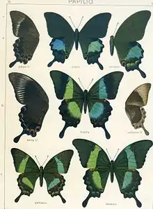 | Papilio karna far right on upper row (dorsal surface) and far left on middle row (ventral surface); remaining are P. paris, P. buddha and P. palinurus | |