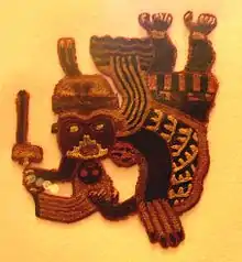 These textiles were made by South American people over a thousand years before the rise of the Inca. They are brightly coloured and show evidence of both a design and a style. The subject of these images are supernatural creatures or shamans who use their hands to hold severed human heads whilst their wings transport them like birds.[2] These could be intended to represent being carried to the next world by spirits or that these figures represent the spirits themselves.[1]