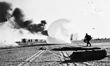 On 5 November 1956, the 3rd Battalion conducted what would become the last British battalion-sized parachute assault. The objective was the El Gamil airfield in Port Said during the Suez Crisis.[110] The battalion secured the airfield and dug in to wait the arrival of the rest of the assault forces by sea. The 1st and 2nd Battalions arrived at Port Said by Landing Ship Tank,[111] the 2nd Battalion were delayed in starting to advance towards Ismailia. The battalion was supported by the tanks of the 6th Royal Tank Regiment, but due to the delay, they were still short of their objective when a ceasefire was announced.[112] On 14 November, the brigade returned to Cyprus.[102]