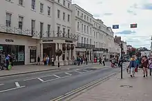 Parade is a 0.51 mile (0.825 kilometre) long street in the town of Royal Leamington Spa, Warwickshire, England. Running in a north-south direction, it forms part of the longer B4087 which runs from the A445 in Leamington to the B4086 in Wellesbourne. The road is the central shopping hub of the town, and upon it sit many of the town’s high street stores, as well as some of the best examples of Regency architecture, for which the town is known. It is often erroneously called "The Parade", and spoken of as such, but all maps and resources such as the Royal Mail's postcode database simply have "Parade".