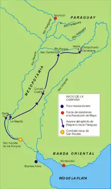 The Paraguay campaign (1810–11) was the attempt by a Buenos Aires-sponsored militia, commanded by Manuel Belgrano, to win the royalist Intendency of Paraguay for the cause of May Revolution. In Paraguay it is considered as their War of Independence.[3] The first battles fought were the Battle of Campichuelo and Battle of Campo Maracana, in which Argentinians claimed victory. However, they were completely vanquished in the subsequent Battle of Paraguarí and Battle of Tacuarí. The campaign ended in a military failure and Paraguay broke its links with the Spanish crown just two months after Belgrano's withdrawal, starting its course towards full independence.
