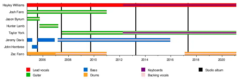 Paramore is an American rock band from Franklin, Tennessee, formed in 2004. The band currently consists of lead vocalist Hayley Williams, guitarist Taylor York and drummer Zac Farro. Williams and Farro are founding members of the group, while York, a high school friend of the original lineup, joined in 2007. Williams is the only member listed on the band's recording contract with Warner Music Group's Fueled by Ramen sublabel and the only member to appear on all five of Paramore's studio albums.[1]