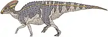 Parasaurolophus (/ˌpærəsɔːˈrɒləfəs, -ˌsɔːrəˈloʊfəs/; meaning "near crested lizard" in reference to Saurolophus) is a genus of herbivorous ornithopod dinosaur that lived in what is now North America and possibly Asia during the Late Cretaceous Period, about 76.5–73 million years ago.[2] It was an herbivore that walked both as a biped and as a quadruped. Three species are universally recognized: P. walkeri (the type species), P. tubicen, and the short-crested P. cyrtocristatus. Additionally, a fourth species, P. jiayensis, has been proposed, although it is more commonly placed in the separate genus Charonosaurus. Remains are known from Alberta (Canada), New Mexico and Utah (United States), and possibly Heilongjiang, (China). The genus was first described in 1922 by William Parks from a skull and partial skeleton found in Alberta.