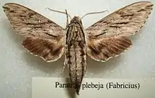 - "Plebeian sphinx (Paratrea plebeja)" Moths of North America. Archived December 2, 2005.
