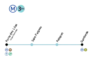 Paris Métro Line 3bis is one of the sixteen lines of the Paris Métro (in Paris, France). It connects the Gambetta and Porte des Lilas stations in the 20th arrondissement of Paris (in the east of the city). With a length of 1.3 kilometres (0.81 mi) and only four stations, the line is the shortest in the network. It is also the least used line, with just over 1.5 million passengers in 2003.