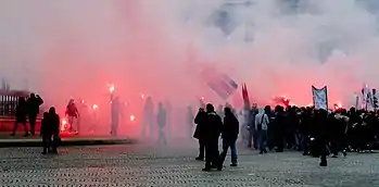 Following Quemener's death, more strict security measures were implemented, including stadium bans and police controls on matchdays.[35][53] This led to a relative cease of fire between the two stands. They even fought together against Twente and Marseille hooligans in December 2008 and October 2009, respectively.[9] Tensions, however, were slowly mounting again in the background.[48] Supras Auteuil subgroup K-Soce Team was born in 2007.[9] Brandishing flags of Algeria and Palestine, they embodied the growing politicization and left-wing radicalization of the Auteuil stand, antagonizing with that of Boulogne.[48][55] Like Tigris Mystic before them, K-Soce Team responded to the racism in the stadium by clashing with Boulogne hooligans.[9]