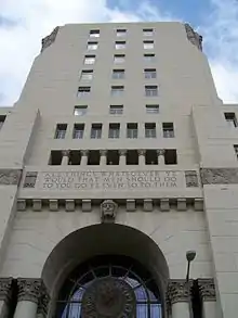 The architectural expression was eclectic, combining classical columns and arches, stylised Art Deco details, a symmetrical Beaux Arts form with a stepped skyscraper silhouette. Designed as a memorial to World War I soldiers, the exterior features stylized Assyrian friezes, sculpted figures in military uniform, and massive cast stone warrior angels guarding the plinth and tower at every corner.[2]