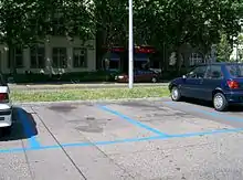Some parking spaces are reserved as handicapped parking, for individuals with disabilities. Handicapped parking spaces are typically marked with the International Symbol of Access, though in practice, the design of the symbol varies widely.[9]