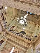 Construction of the Library and eastern wing began in 1858 and was completed in 1860. There was much debate about an appropriate stone for the exterior, with a desire to use stone from Victoria, though none could be found that were known to be entirely suitable. Bluestone was rejected as too dark and sombre, local granite as too expensive, even Carrara marble was considered, but freestone from Bacchus Marsh was chosen. This proved to decay rapidly and large parts had to be replaced with stone from Tasmania within a few years.[6] With the library complete, the two legislative chambers were joined at the rear, resulting in a `U-shaped' building. The classical architectural detail of the east facade were noted as the first expression of Peter Kerr's vision for the building.[4] No further construction took place for 18 years; however, the first set of electrical bells used to call members to divisions were installed circa 1877.