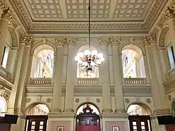 Queen's Hall was used for formal receptions and banquets, while the Vestibule offered a formal entry to Parliament House, though the grand front steps were not to be completed for another decade.[4]