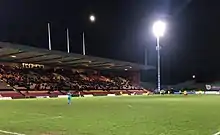 Firhill has been used by other football teams and for rugby over the years. Between 1986 and 1991 Clyde ground shared with Thistle,[78] following their eviction from Shawfield.[79] Hamilton Academical also ground shared for two spells over seven years,[80] following them being forced out of Douglas Park in 1994. In December 2005, Firhill also became the home of Glasgow's professional rugby union team, Glasgow Warriors, when they moved from their previous base at Hughenden Stadium. After returning to Hughenden in 2006, the Warriors took up a two-year residency at Firhill from the start of the 2007–08 Celtic League season.[81] This was extended in April 2009 for a further five years.[82][83] Glasgow Warriors left Firhill after the 2011–12 season and moved to Scotstoun Stadium.[84][85] During the 2012–13 season the ground was also used by Celtic's under-20 squad as their home ground,[86] but following Thistle's promotion this stopped for the 2013–14 season.[87]