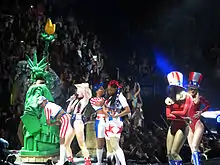 In 2013, Cyrus sang "Party in the U.S.A." during her performances held to promote Bangerz album. She performed the single on Jimmy Kimmel Live!,[79] 2013 iHeartRadio Music Festival in Las Vegas,[80] Today,[81] and the series of Jingle Ball concerts in December (including Jingle Bell Ball in Los Angeles).[82] In 2014 she included this song on her Bangerz Tour. While singing "Party in the U.S.A.", Cyrus has shorter blonde hair, a leotard with red, white, and blue sequins, a white cowboy hat, star spangled boots, and a set of fake teeth during the performance. The backup dancers were dressed as American monuments.[83] Her performance received positive reviews from critics. Théoden Janes of The Charlotte Observer wrote, "She turned a verse of Party in the U.S.A. into a cool, cocky rap"[84] and John J. Moser of The Morning Call said that the performance resonated with the audience, even though Cyrus was lifted atop a huge pedestal.[85] Jane Stevenson of the Toronto Sun wrote, "She went for a big ending, with fireworks, confetti, an elevating stage and dancers dressed as Abe Lincoln, Mount Rushmore, the Liberty Bell and The Statue of Liberty for the final older song Party in the U.S.A."[86] A critic from Nashville Scene wrote, "Party in the U.S.A. was sung by Miley and screamed back by every person in the crowd. Cue red-white-and-blue confetti. Cue fireworks. Pack the Bangerz Tour up and put the circus back on the road. Fans in other cities need to party, too."[87] Cyrus also performed the song during the musical festival on June 21, 2014, Summertime Ball at Wembley Stadium of London, in front of 80,000 people.[88]