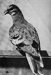 The adult female passenger pigeon was slightly smaller than the male at 380 to 400 mm (15.0 to 15.7 in) in length. It was duller than the male overall, and was a grayish-brown on the forehead, crown, and nape down to the scapulars, and the feathers on the sides of the neck had less iridescence than those of the male. The lower throat and breast were a buff-gray that developed into white on the belly and undertail-coverts. It was browner on the upperparts and paler buff brown and less rufous on the underparts than the male. The wings, back, and tail were similar in appearance to those of the male except that the outer edges of the primary feathers were edged in buff or rufous buff.[22][33] The wings had more spotting than those of the male.[32] The tail was shorter than that of the male, and the legs and feet were a paler red. The iris was orange red, with a grayish blue, naked orbital ring. The wing of the female was 180 to 210 mm (7.1 to 8.3 in), the tail 150 to 200 mm (5.9 to 7.9 in), the bill 15 to 18 mm (0.59 to 0.71 in), and the tarsus was 25 to 28 mm (0.98 to 1.10 in).[22]