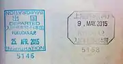A circular entry stamp in black ink is applied to passports of all nationalities at the time of entry. A triangular multi colored entry stamp was used until 2015. An exit stamp is also applied to all passports when leaving the country. Exit stamp in use at present is rectangular in shape and black in color.