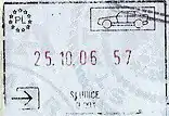 The stamps are always in black except the date, which is in red. The stamps feature an arrow at the top left corner, pointing left to denote departure, or pointing right for arrival together with a cartoon of the mode of transport at the top right corner.