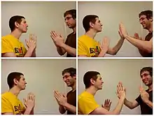 The "pat-a-cake" song and clapping game was used by Bob Hope and Bing Crosby in their series of "Road" films as a means of distraction. The gag worked by means of adding a synchronised punch into the clapping game routine, allowing them to make their escape.[5]