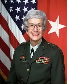 General Foote had many notable achievements during her career. She became the first female public relations officer in Vietnam in 1967.[4] In 1979 she became the first female faculty member of the U.S. Army War School.[5] General Foote was also the first female brigade commander in Europe, and became the first female inspector general in the Army in 1986.[4] When Foote was promoted to Brigadier General in 1986, she became one of only four female generals in the U.S. Army. She was also the first female commander of Fort Belvoir, Virginia.[6]