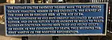 At length, he was summoned before a council of bishops and clergy presided over by the archbishop. There were thirteen charges, seven based on the doctrines affirmed in Philip Melanchthon's Loci Communes, the first theological exposition of Martin Luther's scriptural study and teachings in 1521. On examination Hamilton maintained their truth, and the council condemned him as a heretic on all thirteen charges. Hamilton was seized, and, it is said, surrendered to the soldiery on an assurance that he would be restored to his friends without injury.[2] However, the council convicted him, after a sham disputation with Friar Campbell, and handed him over to the secular power, to be burnt at the stake as a heretic, outside the front entrance to St Salvator's Chapel in St Andrews. The sentence was carried out on the same day to preclude any attempted rescue by friends. He burnt from noon to 6 p.m.. His last words were "Lord Jesus, receive my spirit".[8] The spot is today marked with a monogram of his initials set into the cobblestones of the pavement of North Street.