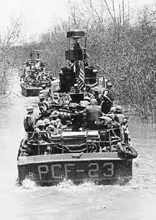 For the Swifts, coming back down river was always more dangerous then going up river. The passage of a patrol assured their eventual return, providing an opportunity for the Viet Cong. Ambushes were typically short lived affairs, set up at a river bend or in a narrow canal that restricted the maneuverability of the boats.[3] A wide variety of portable weapons were used in attacks, including recoilless rifles, B-40 rockets, .50 caliber machine guns and AK-47s, often fired from behind earthen bunkered positions.[4] Engagements were brief and violent, with the ambushers often slipping away into the undergrowth when the boats located the source of attack and began to concentrate their return fire. When attacked the boats would accelerate out of the hot zone, turn and then return as a group, firing as many of their guns as they could bring to bear. They would power past the ambush point, turn and return to attack again till the ambushers were either killed or slipped away. Though most cruising and patrolling was done at 8 to 10 knots, the boats could reach a top speed of 32 knots. Thick brush and vegetation in the delta provided excellent cover for the escaping ambushers. Casualties taken among the river crews were high. Casualties suffered among the Viet Cong were difficult to assess, as they would take their dead and wounded away from a firefight. Discovering newly dug graveyards was one of the few ways to confirm Viet Cong losses.[5]