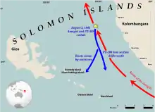 Late in the night, Kennedy's 109 and two accompanying PTs became the last to sight the Japanese destroyers returning on their northern route to Rabaul, New Britain, New Guinea, after they had completed dropping their supplies and troops at 1:45 a.m. on the southern tip of Kolombangara.[28] The official Navy account of the incident listed radio communications as good, but PT commanders were also told to maintain radio silence until informed of enemy sightings, causing many commanders to turn off their radios or not closely monitor their radio traffic, including Kennedy.[29][30][31]