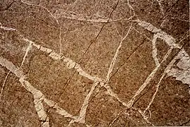 Cracks are linear openings that form in materials to relieve stress. When an elastic material stretches or shrinks uniformly, it eventually reaches its breaking strength and then fails suddenly in all directions, creating cracks with 120 degree joints, so three cracks meet at a node. Conversely, when an inelastic material fails, straight cracks form to relieve the stress. Further stress in the same direction would then simply open the existing cracks; stress at right angles can create new cracks, at 90 degrees to the old ones. Thus the pattern of cracks indicates whether the material is elastic or not.[77] In a tough fibrous material like oak tree bark, cracks form to relieve stress as usual, but they do not grow long as their growth is interrupted by bundles of strong elastic fibres. Since each species of tree has its own structure at the levels of cell and of molecules, each has its own pattern of splitting in its bark.[78]