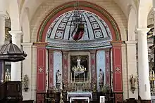 The Saint Martin's church is situated in the heart of Pauillac on Marshal Joffre Square. In November 1824 were laid the foundations before it would be delivered to worship in May 1828 and completed in 1829. The church was partly built out of the materials from the former church which had become too small. The Bordeaux architect Armand Corcelles was inspired by Greek art. The western façade is topped by a huge pediment which supports an octagonal tower made of two superimposed towers. The first tower houses three bells. Two of them date from 1784 and come from a former church. The third bell, cracked by too brisk and cheerful ringing during the Liberation in 1945, was melted again, baptized and named Edouard-Jeanne-Victoire in 1946. Inside, the nave has eight doric columns. In the choir, the white marble baroque style main altar is covered by a semi-dome. A canopy just above the altar lights it perfectly. An oculus, on a baroque piece of sculpture background, illuminated by the rising sun, represents the triangle of the Divine Trinity. This church also has an ex-voto: a small replication of the warship Saint Clement, hanging from the vault in the centre of the nave. It was offered in 1836 by the pilots and coastal pilots of Pauillac: "To honor the memory of Pope Saint Clement, the patron saint of Pauillac naval station sailors, pilots, coastal pilots and aspirants, all Catholics." The model was restored in 1996. The back of the church is occupied by a large organ loft supported on iron columns. It consists of fifteen stops and was made of wood from Onega, Russia, and northern oak for the organ facade. On the left side of the nave is a wooden pulpit built right up against a pillar surrounded by a double spiral staircase. Facing the pulpit is a Christ on the Cross. On the three walls around the church is a Way of the Cross, fourteen paintings that reproduce the Passion of Christ.[6]