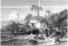 On the return voyage in 1787, fearing scurvy among his crew, Langle and La Pérouse landed on the Samoan island of Maouna to look for drinking water and fresh food, which they were running out of (Langle and La Pérouse both recognised the importance of fresh food in fighting scurvy, and – unlike La Pérouse[4] – was persuaded by the observations of Captain Cook that fresh water was also valuable in this regard). With their boats laden with water barrels, they waited for a tide high enough to rejoin their ship, but, according to the survivors' accounts, they were in the meantime faced with ravishing young women, their hair decorated with hibiscus, advancing across the beach towards them and offering them sex. After many weeks at sea, these advances were evidently not unanimously rebuffed and extreme confusion and disorder followed.
