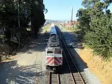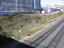 The Bayview Hunters Point Community Revitalization Concept Plan (March 2002) identified the Oakdale-Palou area as the community's preferred location for the Caltrain station.[15] A 2005 feasibility study proposed a new station just north of Oakdale Avenue (37.738°N 122.3948°W) next to the City College of San Francisco Southeast Campus in Bayview, 1.0 mile (1.6 km) north of the former Paul Avenue station. The new station would have platforms passing over Quint, and bus stops for four lines would be located within walking distance of the new station.[16]:18 Just north of Oakdale, freight trains are routed east along the Quint Street Lead, which branches from the main line, to the Intermodal Freight Rail Cargo Transfer Facility near Piers 90–96.[16]:27 A follow-up study in 2014 predicted daily ridership of around 2,350.[6][17] In the vicinity of the proposed station, the Caltrain line is grade-separated from Oakdale (which passes over the rail line) and Quint. Prior to 2016, the rail line was carried over Quint on a steel bridge originally constructed for the Bayshore Cutoff in the early 1900s. In preparation for a new Oakdale station, the bridge, which was structurally deficient, was removed on April 30 and replaced by a berm completed in July 2016, which severed Quint between Oakdale and Jerrold.[18] A new road has been proposed on land belonging to Union Pacific west of the tracks, to reconnect Quint to Jerrold.[19]