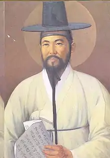 | Attributes | Hanbok and gat, crucifix, palm of martyrdom |