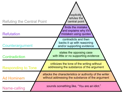 Graham proposed a "disagreement hierarchy" in a 2008 essay "How to Disagree",[23] putting types of argument into a seven-point hierarchy and observing that "If moving up the disagreement hierarchy makes people less mean, that will make most of them happier." Graham also suggested that the hierarchy can be thought of as a pyramid, as the highest forms of disagreement are rarer.