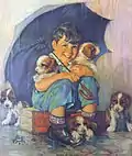 His drawings also ended up on Gerlach Barklow calendars, ink blotter cards and prints for business advertising, such as one titled "Singin' in the Rain" from 1931. It showed a boy sheltering several pups from the rain with an umbrella, while squatting down (pictured).[63] Another showed a boy reading about scientific theories with some difficulty.[64] Martin's paintings often included a cute and friendly pup (or more!). He drew covers for such trade publications as Advertising & Selling,[65][24] Good Hardware,[66] Progressive Grocer (voice of the industry for food retailers)[67] and Silent Hostess (recipes and tips for homemakers)[68] between 1920 & 1931. Coincidentally, the helmet-wearing kid for H-O Oats (pictured), later served as Progressive Grocer's associate editor from 1956–62.[69] Martin's third and fourth covers were for this food-oriented magazine.[70] His work appeared in many different types of print media.[71]