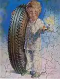 The now-updated version was first used by Fisk Tires, to showcase its newly introduced "Air-Flights" in advertisements. This included twelve times in The Saturday Evening Post, between Feb. 8 and Aug. 23, 1930 (latter pictured).[99][100] It was offered to the public as a "suitable for framing," 11x14 colorful art print.[101] The cheerful mascot then appeared on many different products. These were either with or without a facial touch-up (three variants pictured).[102] For instance, on the front cover and endpapers of children's books in 1931. Subjects (8): Candy Land, Jack and the Bean Stalk, Little Black Sambo, Peter Rabbit, Pied Piper, Three Bears, Three Little Kittens and Three Little Pigs.[103] They were all subtitled, Time to Re-tire / A Bedtime Story. It also appeared on ashtrays,[104] bridge score pads,[105] cigarette cases,[106] electrical clocks,[107] jigsaw puzzles (#1 pictured),[108][109] matchbooks,[110] posters[111] and rubber heel replacements for shoes.[112] These were complimentary items for customers or potential customers.[113][114] Martin's figure was used by Fisk retailers on their data books,[115] display windows,[116] letterheads and mailing envelopes-(pictured).[117] It showed up in a scaled-down form, in Boys' Life and other magazines[118] (along with hundreds of newspapers)[119] from 1930–34. Fisk Tires then went back to the original sleepy boy in 1935.[120] The all-important public preferred that one, even though other companies had successfully modernized their own mascot (some multiple times).[121] Incidentally, Norman Rockwell drew many paintings featuring the trade character, which were published in 1917–20, 24–25.[122]
