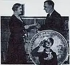 He painted a contest-winning poster for the Girl Scouts in 1931. It was titled "Usefulness • Beauty • Health • Truth • Knowledge."[50][51][52] This contest was conducted by the Art Alliance of America,[53] an organization that brought together craft workers and manufacturers. There were two hundred plus submissions.[54] The six-judge panel consisted of W. T. Benda (who replaced Charles Dana Gibson),[55] Ray Greenleaf, Rockwell Kent, John La Gatta, Neysa McMein and Edward A. Wilson.[56] Martin's model for the poster was Barbara Smith, a 14-year-old from Darien, Connecticut[56] (who previously lived in Yonkers, N.Y.).[57] Her parents and Martin were lifelong friends. He even served as best man at their wedding back in 1904.[58] His winning entree earned him a first-place check, from the Girl Scouts' National Director Josephine Schain (pictured). This exchange took place at their then national headquarters on Lexington Avenue in New York City. Also, right after Schain presented the second and third place winners with their cash prize.[59] National President Mrs. Frederick (Birdsall Otis) Edey was one of three consultants, along with executives Anne Hyde Choate and Genevieve Garvan Brady.[55] This poster (reshaped & inserted in pictured) later appeared with three raised fingers instead of a salute,[60] on the cover of Girl Scout Equipment catalogs for Fall 1932 and Spring 1933.[61] It faithfully and strikingly captured the spirit of their character-building movement.[56] Martin said at the award ceremony, "Barbara seems [to be] the personification of all that Girl Scouting means. She is the very spirit of radiant, happy and wholesome young girlhood, and my mind naturally turned to her immediately when I learned of the competition."[62]