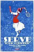 Martin designed "Wrigley Gum's" light bulb spectacular, which showcased six acrobatic "spearmen" on a Broadway billboard in 1917.[24] It was then the world's largest ever electrical display at 200' x 50'.[25] It covered the entire city block between 43rd and 44th Streets.[26][27][28][29] This Times Square light show, was a major tourist attraction for seven years.[30][31] He drew a poster titled "Serve Your Country," for the War Camp Community Service in 1918. It showed a fashionable young woman serving in tennis (play on words).[32] Women were encouraged to entertain off-duty soldiers, by participating in various social events (dancing, dining etc.).[33] A silkscreen version of this poster (pictured below), has been periodically on display at the International Tennis Hall of Fame Museum in Newport, Rhode Island.[34]
