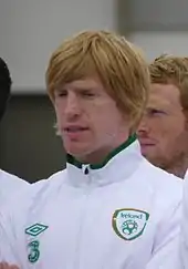 McShane received his first senior international call-up to the Republic of Ireland squad from manager Steve Staunton on 25 September 2006, for the UEFA Euro 2008 qualifiers against Cyprus and the Czech Republic.[40] An injury to Andy O'Brien and the suspension of Richard Dunne (the two central defenders that had started the match against Cyprus) meant that McShane was given his first international cap against the Czech Republic on 11 October 2006.[41] The match ended in a 1–1 draw, with McShane being named man of the match.[42] McShane was part of the team that missed out on place at the 2010 FIFA World Cup after being defeated by France in Paris in a play-off, and was the Irish player directly behind Thierry Henry[43] when Henry twice handballed late in extra-time before crossing for William Gallas to score an illegitimate, but accepted, goal.[44]
