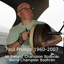 Paul Phillips (1959–2007) was one of Ireland's most popular and respected bodhrán players and teachers, immersed in the drum as an art form and in particular in the development and promotion of the style of play known as top-end. He shared stages at various times with Mary Bergin, Lunasa, Michael McGoldrick, Sean Ryan, Gerry O'Connor, Steve Cooney, Seamus Tansey and more. He was a regular member of Darragh Folk and Reely Jiggin. Phillips taught and toured widely across Europe, the United States and even as far afield as Timbuktu in the Sahara in 2006, bringing the drum to ever wider audiences. He was an experienced teacher and Comhaltas adjudicator and taught at many of the main summer schools in Ireland.