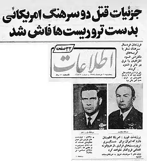 Col. Paul R. Shaffer (1930–1975) was a United States military aide to Iran who, along with another US officer, Lieutenant Colonel Jack H. Turner, was assassinated by Marxist terrorists. Col. Shaffer had served as an air force pilot in both Korea and Vietnam.[1][2] The People's Mujahedin of Iran (MEK) was responsible for the assassination.[3] In the newspaper clipping, Col. Shaffer is on the left and Lt. Col. Turner is on the right.