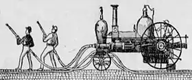 Under the sponsorship of an insurance company,[2] in 1840–1841, Hodge designed and built the first fire engine in the United States[upper-alpha 1] that was steam powered.[1][4][5][6][7] It was also the first self-propelled fire engine; the engine used a dog clutch on the rear axle for movement, navigation, and steering.[6] It could throw a jet of water of 290 tons per hour (about 20 US gallons (76 l) per second) 166 ft 0 in (50.60 m) high.[3][7] The horizontal cylinders lined up with the pump cylinders and worked with a pair of driving wheels. At the front axle, ahead of the smoke-box, was an air vessel that activated a bell. In 1896 the fire engine was reported to have weighed around 7 or 8 tons, and was 13 ft .5 in (3.98 m) long. The large back wheels of the fire engine were lifted off the ground by a built-in jackscrew when pumping water for use on a fire, whereupon they served as flywheels for the engine as it pumped.[6]