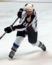 Before training camp, it was not expected he would start the season with the Avalanche, but rather for an affiliate team of the Avalanche.[1][19] However, Steve Konowalchuk's career-ending heart problem opened a roster spot and Stastny's play impressed Avalanche coach Joel Quenneville.[19][32] Stastny started the season with the jersey number 62 until his teammate John-Michael Liles (switching to #4) changed his to let Stastny use #26, the same his father wore when he played for the franchise while it was in Quebec.[33] Stastny had his first NHL assist on a goal by Wojtek Wolski in his third NHL game, on October 8 against the Vancouver Canucks.[34][35] On October 21, in his eighth NHL game and first wearing number 26, Stastny scored his first NHL goal in Montreal against David Aebischer of the Montreal Canadiens.[36]