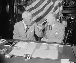 By 1938 the press speculated that McNutt would, despite opposition from Roosevelt supporters, "have to be reckoned with" for the 1940 Democratic nomination for president because of his military and American Legion service, gubernatorial record, and "astonishingly good looks."[13] He left the Philippines in 1939 to become head of Roosevelt's new Federal Security Agency, an umbrella office that managed an array of New Deal programs that ranged from the Civilian Conservation Corps to Social Security. It also served as a cover agency from 1942 to 1944 for the War Research Service, a secret program to develop chemical and biological weapons. The FSA job gave McNutt high visibility, but his presidential hopes ended because Roosevelt decided to seek a third term. Although McNutt's name was floated as a possible vice-presidential running mate, Roosevelt apparently did not seriously consider the possibility, preferring the more liberal Secretary of Agriculture Henry A. Wallace. Coincidentally, Roosevelt's opponent in 1940 was McNutt's Indiana University classmate and Beta Theta Pi fraternity brother Wendell Willkie, now a Republican.
